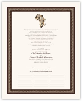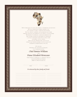 Add some African culture to your wedding ceremony with this African inspired wedding certificate. As pictured, this document features a Vine border and is in rich, deep, earthy tones. The colors can be customize to any of your liking, and the text may be changed to your own vows or a verse of your choosing.