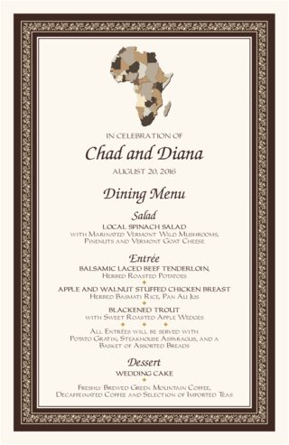 Add some African culture to your wedding tables with these Map of Africa dinner menus. They are a personalized and unique way to add a little interest to your tables. Customize each menu wth your menu courses, borders, fonts, colors, monograms, or text.