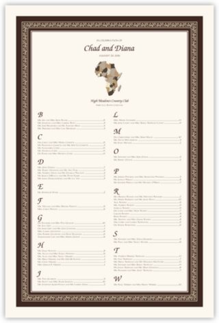 Rather than use escort cards to let your guests know where they are sitting, be unique and use this Africa-inspired seating chart instead. Each guest or couple can be listed on the chart with the seating assignment, and is meant to be placed on an easel near the doors of the reception hall. The chart can be sized to your needs, but is generally 24" x 36". Customize it with your choice of borders, fonts, colors, monograms, and text.