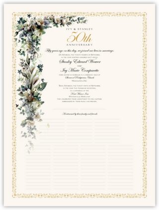 This wedding anniversary and renewal of vows certificate features a Calla Lilies and Gardenias painting and a gold border. Shown as a 50th anniversary certificate, it can be customized to any anniversary with different colors and wording.