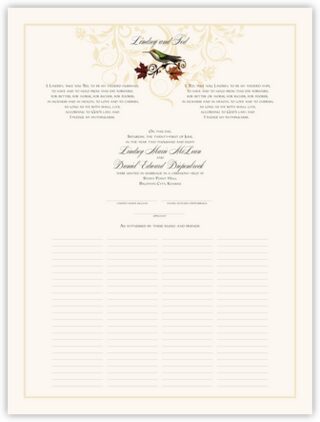 Our Fall Indy Flourish wedding document mixes both classic and contemporary elements to give what you see here. It features a large, contemporary flourish at the top of the certificate with a birds and fall leaves painting. Customize the marriage certificate with your choice of colors, fonts, and illustrations.