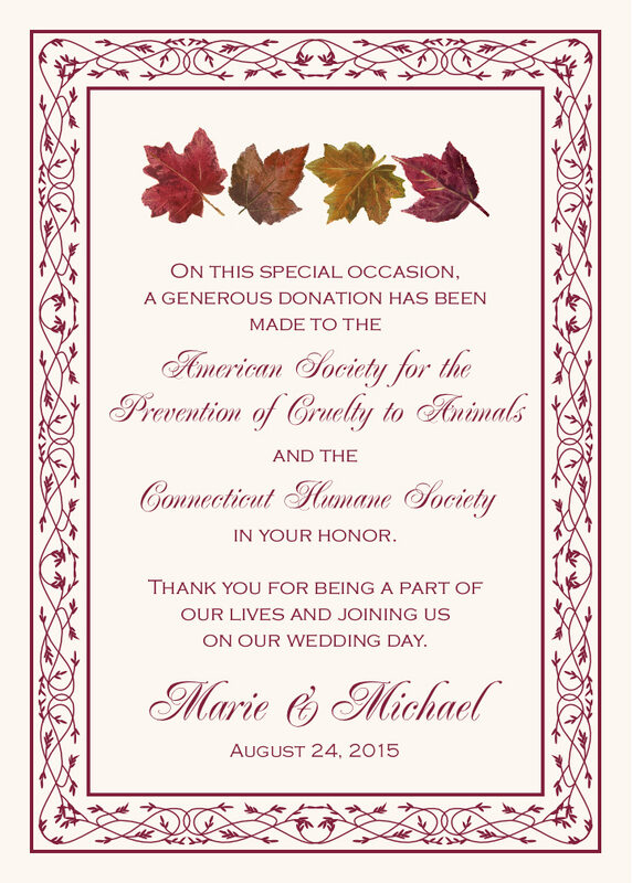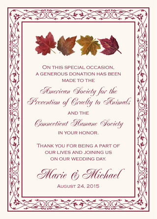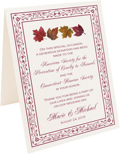 These Maple Leaf Pattern fall-themed donation cards are a perfect addition to your autumn wedding reception. As traditional favors are more-and-more being fazed out and replaced with donations to certain charitable organizations, you should let your guests know which charity means most to both you and your fiancé. Customize each card with your choice of wording, fonts, colors, borders, and illustrations.