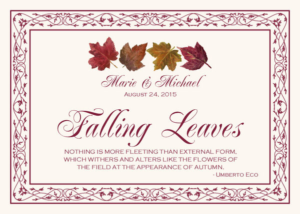 Maple Leaf Pattern autumn memorabilia table cards are a replacement for table names and table numbers. Add your own table names and paragraph to add a unique touch to your tables at your wedding reception. Customize each card with your choice of fonts, colors, borders, and illustrations. A full set of matching accessories is available.