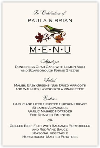 This relatively simply menu showcases a watercolor painting of a bird sitting on branch of pretty autumn leaves. Let us customize it or add additional color to it by changing the type color, or adding one of our numerous border styles that we offer. Each menu will be finished with your menu information and sized to your specifications.