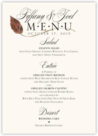 Fall is in the air! These wispy leaf wedding reception menus would make a perfect addition to your rehearsal, reception, or dinner party. We offer more than 30 wispy leaves to choose from, and can customize any of the cards with your own menu, fonts, borders, or colors. We offer a full selection of matching leaf reception accessories, from programs to place cards.