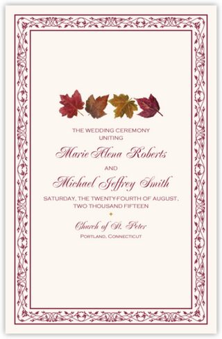 Warm up your autumn wedding ceremony with these Maple Leaf Pattern wedding programs. Each marriage ceremony program is 100% customizable, including the fonts, borders, colors, and illustration selections. Generally, you will send us your wedding party, order of service, and a thank you note and remembrance for the program, but you can include anything you would like. A full range of matching fall Maple Leaf Pattern accessories is available.