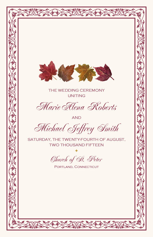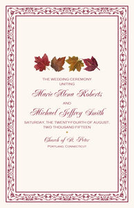 Warm up your autumn wedding ceremony with these Maple Leaf Pattern wedding programs. Each marriage ceremony program is 100% customizable, including the fonts, borders, colors, and illustration selections. Generally, you will send us your wedding party, order of service, and a thank you note and remembrance for the program, but you can include anything you would like. A full range of matching fall Maple Leaf Pattern accessories is available.