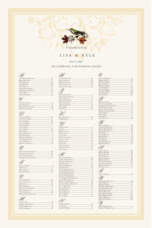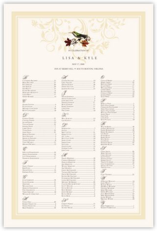 Our Fall Indy Flourish wedding seating chart mixes both classic watercolors and contemporary flourish elements to give what you see in this example. It features a large, contemporary flourish design at the top of the certificate with a birds and fall leaves painting, and a thick triple line border framing the seating chart. Customize this seating chart with your choice of colors, fonts, and illustrations, as well as by adding your wedding party or your reception dinner menu to the chart.
