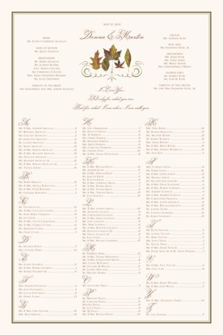 The Five Leaves fall wedding seating chart features an autumn leaves illustration. Explore Documents and Design's complete collection of fall leaf illustrations and leaf pattern designs for complimentary wedding and special event stationery.