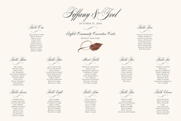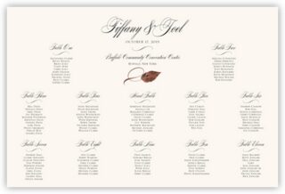 Instead of setting up a table and using place cards, let your guests know where they're sitting with this Wispy Ironwood Fall Leaf Seating Chart. We can customize the seating chart for you in any way imaginable, from adding a border, to changing the fonts, or adding a menu or poem to the chart.
