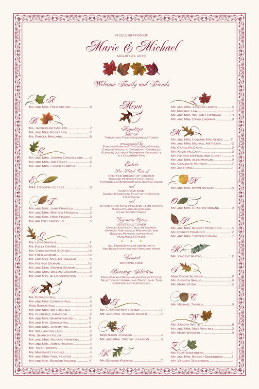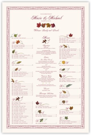 Instead or in addition to using place cards, dress up your fall wedding with this Maple Leaf Pattern wedding seating chart. List each guest alphabetically on the seating chart with their seating assignment and display near the doors of the reception hall. Pictured in the sample below, you may optionally include your menu down the center of the chart.