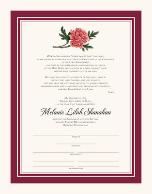 This classic, floral baptism certificate is pictured with a burgundy triple line border and a peony at the top, which in many cultures is a symbol for riches and honor, and is an appropriate motif for both boys and girls. These details, as well as the verse, on this christening certificate can be customized at no additional cost. We have a wide variety of additional flower illustrations, rose illustrations, and orchid illustrations in our library of designs to choose from, and be sure to check out our collection of fonts and borders for even more options.