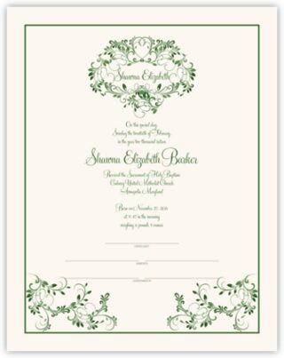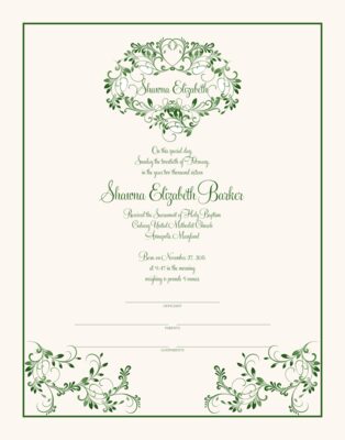 Give your child an everlasting keepsake for their Baptism. This Christening certificate features vines in the corners with an ornate decorative vine monogram. Let us customize at any aspect of this design for you, including the fonts, colors, text or monogram. All at no additional cost.