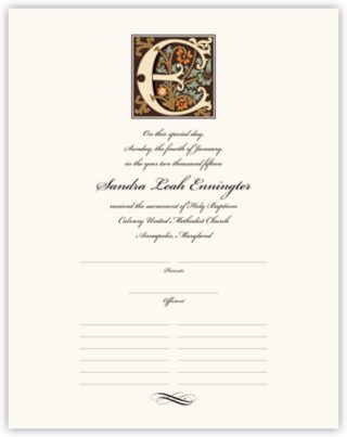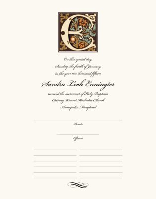 This elegant christening certificate has a decorative monogram intertwined with flowers and vines. Customize this baptism certificate with your choice of colors, borders, or verse.