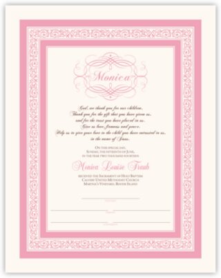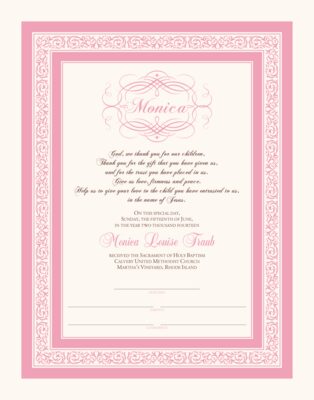 As pictured, this baptism certificate featured one of our popular flourish monograms with an an arabesque border. Customize this design with your choice of fonts, borders, colors or monograms. All of our baptism and christening certificates are printed on a heavy cotton, archival quality, watercolor paper with acid-free inks that will last the test of time without fading.