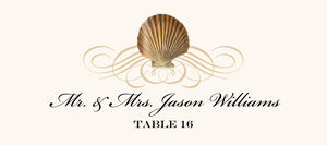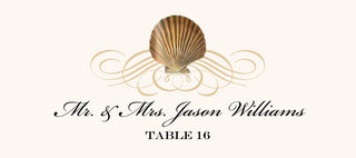 These seashell flourish place cards make an excellent addition for your spring, summer, or destination wedding. Each place card features a sand-toned scallop seashell overlaid on an elegant flourish. The seashell and flourish can be customized in any color you would like.
