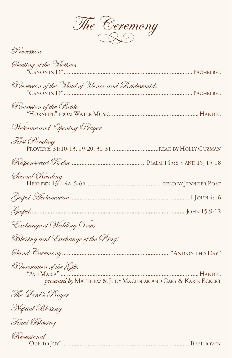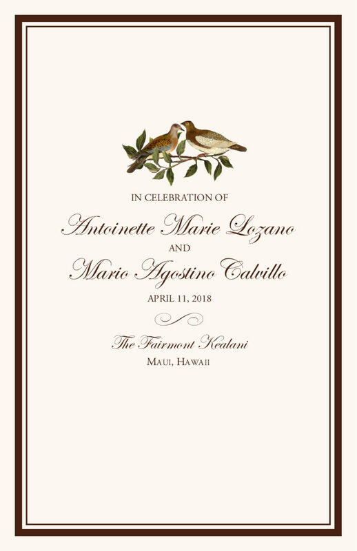 These wedding programs features the bride and groom's name, date, ceremony location, and a painting of two brown birds on the cover - framed in a double line border. Let us add your wedding party, ceremony information, thank you note, remembrance, or anything else to the program. We can change the fonts, borders, colors, and you can select different birds from our Bird Collection to personalize this seating chart to your event decor.