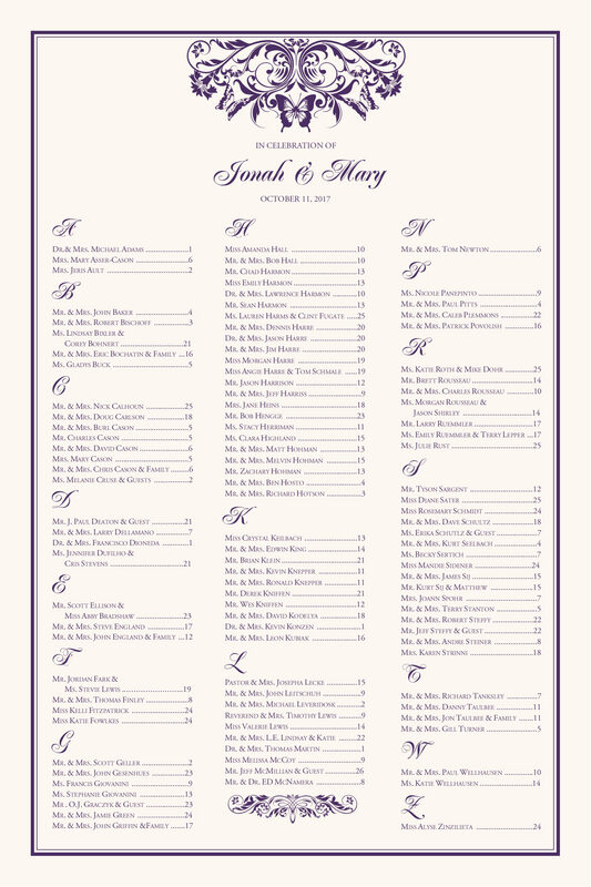 Our Vintage Chrysalis Seating Chart features an elegant butterfly and floral illustration that can be in any color you desire.This would be an excellent addition to any wedding incorporating a butterfly release.