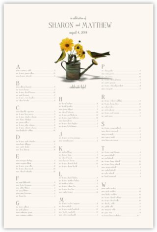 The Sunflowers, Watering Can & Yellow Birds wedding seating chart has a whimsical country theme. It is part of Documents and Design's Hometown Memories series of illustrations for wedding reception stationery.