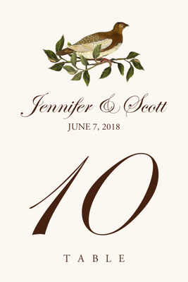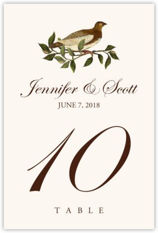 These table numbers feature a the bride and groom's name, celebration date, and a painting of a brown bird at the top. Let us change the fonts, colors, or choose a bird illustration from our Bird Collection to personalize these table cards to your event decor.