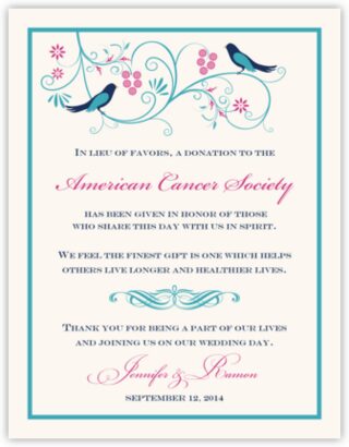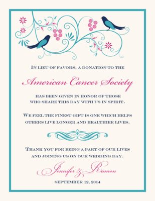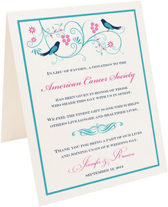 Giving a charitable donation in place of, or in addition to, traditional favors has grown in popularity over the years. Let your guests know that you have made a donation in their honor to your favorite charity with these custom contempory wedding donation cards. Choose between a card that you put on every plate, or a tent that you'd put on each table, and let us customize it with you choice of wording, colors, fonts, and borders.