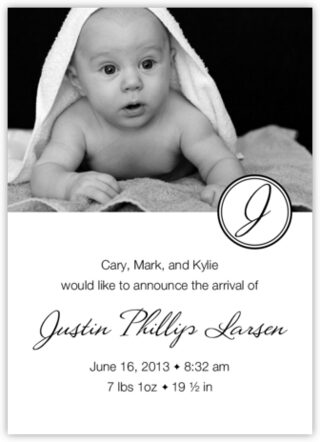 Our Tempest photo birth announcements are a perfect way to introduce your little one to the world. This design includes room for a color or black-and-white photo and a monogram. All of our birth announcements are printed on the finest heavyweight cotton card stock.