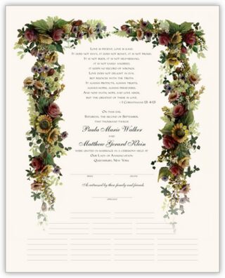 The Burgundy Roses and Sunflowers wedding certificate is an original and unique hand-painted watercolor certificate. Customize it with your choice of verse or text, as well as the number of signature lines you need. It can be used as a replacement or in conjunction with a guestbook, and is meant to be framed and displayed in your home as a reminder of the promises you made on your wedding day. Each certificate it printed on a heavy, archival-quality watercolor paper with acid-free inks.