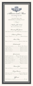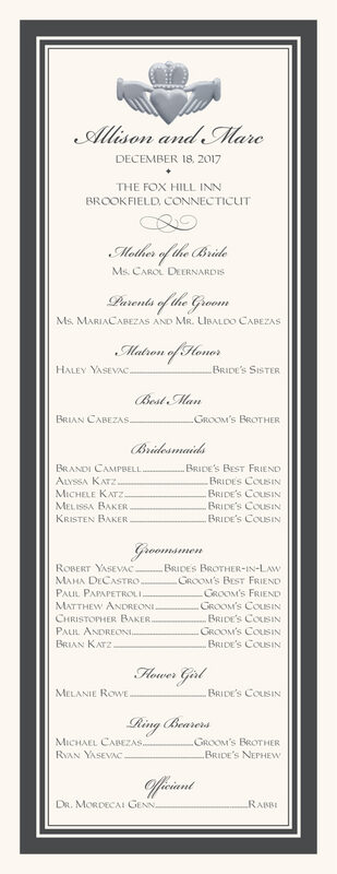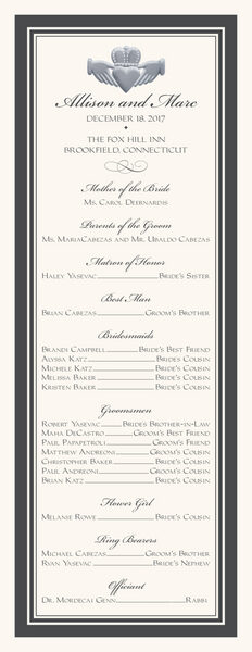 This Celtic inspired wedding program features a silver claddagh illustration at the top, and framed by a triple line border in Charcoal to match the design. The claddagh colors, border colors, and fonts can all be customized. As pictured, this program is a front and back card, but can be created as a booklet instead if requested.