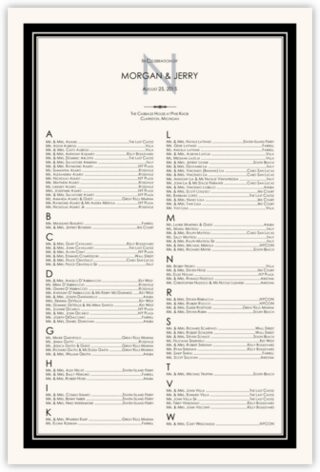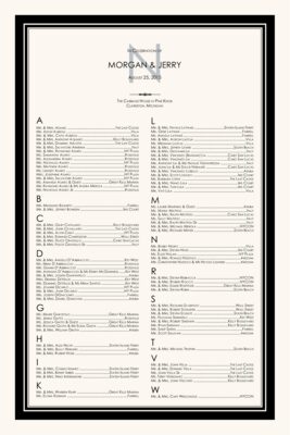 This black and white seating chart features a classic monogram at the top, and a thick border surrounding the list of guests. Choose from our wide variety of monograms, or order the chart as pictured. Are you looking to add a little color? We can change any of the colors on the seating chart, from the border, to the text and monogram at no additional cost.