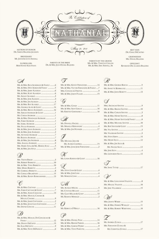 The French Typographic Library 08 wedding seating chart with an antique flourish design is inspired by turn of the century typography styles. Explore Documents and Design's collection of historic type designs, flourishes and frames for seating charts and other special event stationery.