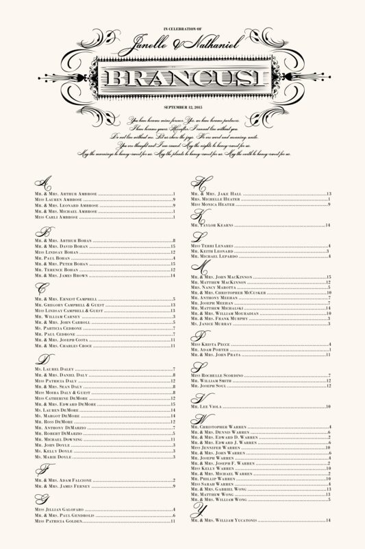 The French Typographic Library 10 wedding seating chart with an old world flourish design is inspired by turn of the century typography styles. Explore Documents and Design's collection of historic type designs, flourishes and frames for seating charts and other special event stationery.
