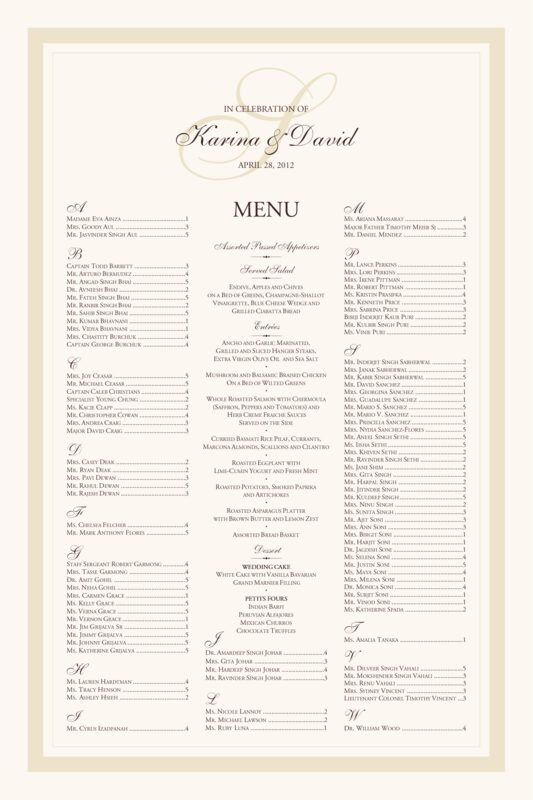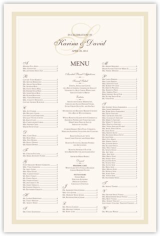 Elegance monogram seating chart with optional menu for wedding receptions and special events.