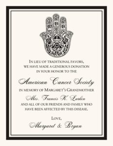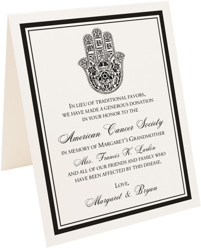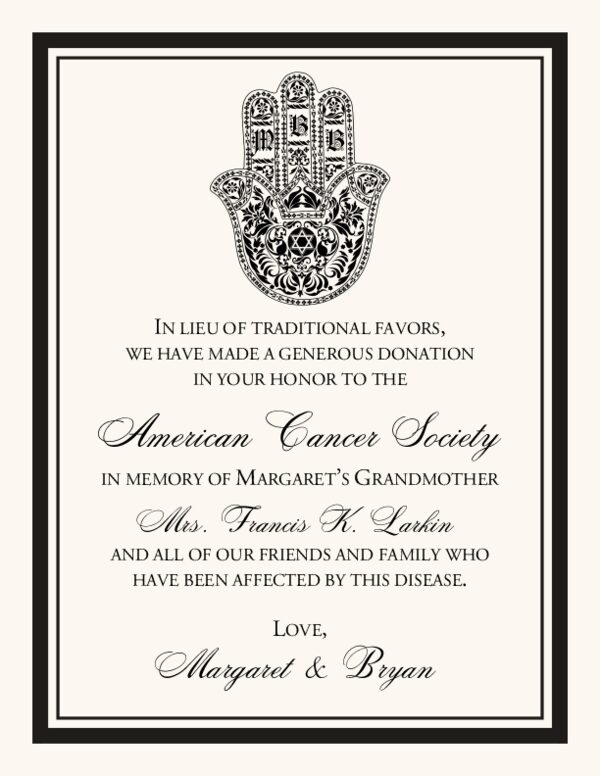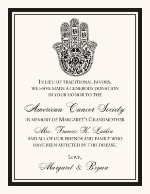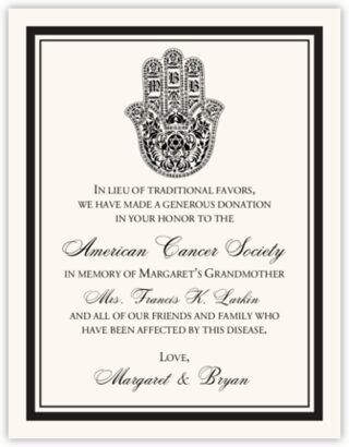 This Jewish Hand of Miriam donation card is the perfect way to let your guests know that you have made a donation in their honor to a charity both you and your fiancé have strong feelings towards. The Hand of Miriam (Hasma) is an ancient symbol that originated in the Middle East and is used in many cultures. It symbolizes security, luck, and good fortune. Our stylized version of the Hand of Miriam monogram includes a space for the bride and groom's monogram letters, and we can customize it with your choice of fonts, colors, borders, and text.