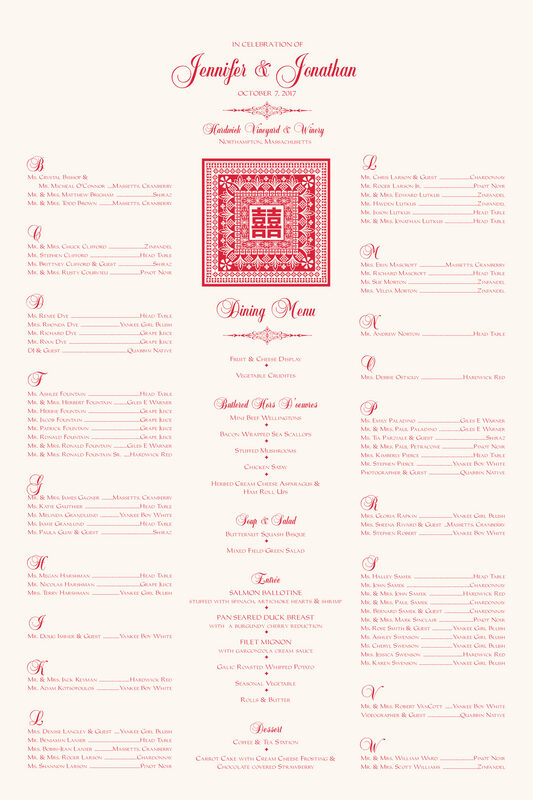 Bring a touch of the Far East to your wedding with this Chinese Double Happiness Pattern seating chart. Let us customize it with your choice of colors or fonts, or let us add a border.