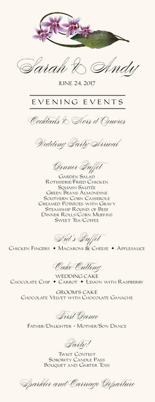 These Purple Calypso Orchid wedding reception menus feature an elegant painting of an orchid at the top of each card, along with the bride and groom's name, and the wedding date. The sample below includes the reception event schedule, but can simply be the menu information if you desire. The colors, fonts, and orchid can be changed in any way to match your decor.