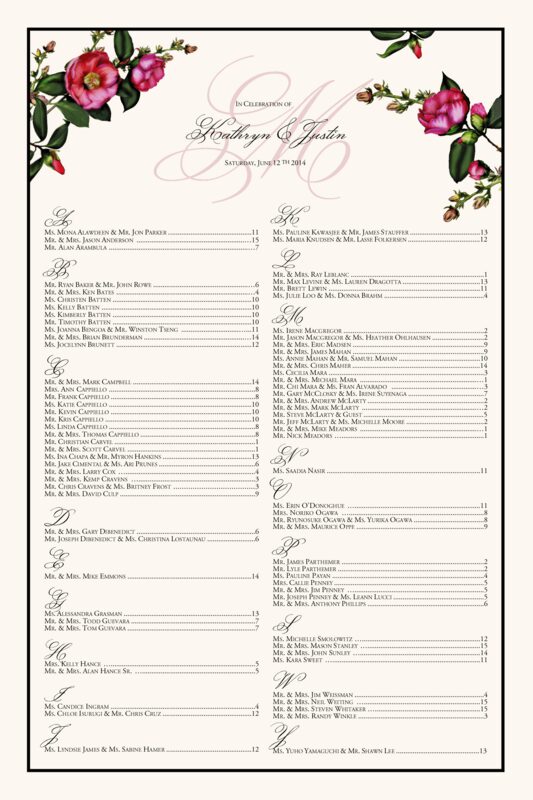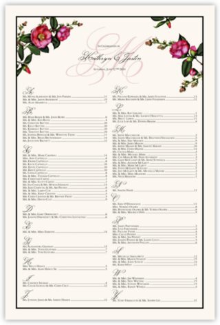Camellia flower wedding seating chart. Explore Documents and Design's exclusive botanical and flower illustrations for custom wedding seating charts and coordinated stationery products.