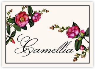 Camellia flower wedding table name cards. Explore Documents and Design's exclusive botanical and flower illustrations for custom wedding table cards and coordinated stationery products.