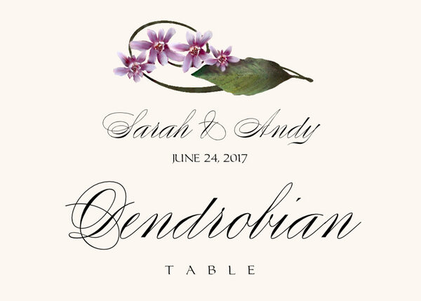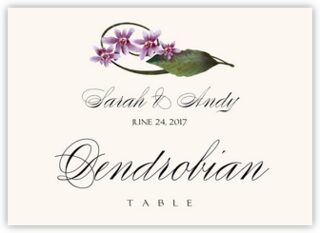 These Purple Calypso Orchid Table Name cards feature an elegant painting of an orchid at the top of each card, along with the bride, groom, and wedding date. The colors, fonts, and orchid can be changed in any way to match your decor.