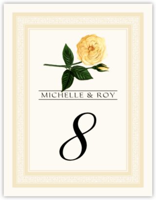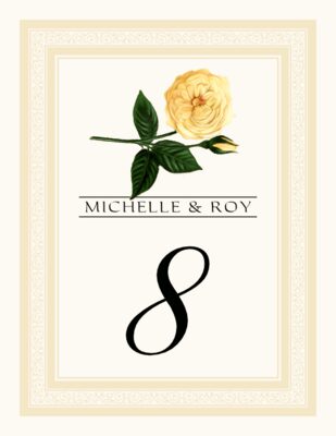 Roses are a universal symbol for love, and can be found at nearly every wedding. Let these unique yellow rose table numbers complement your tables and centerpieces at your wedding. We have a wide selection of roses, orchids, and other flowers to choose from, and we'll be more than happy to change any of the fonts, borders, or colors for you.