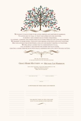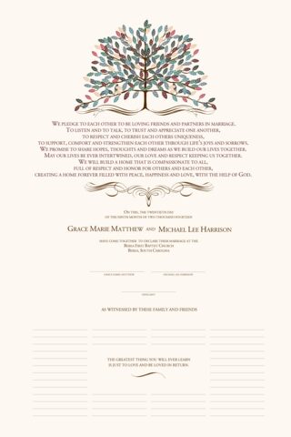 Arbor Day Tree of Life Wedding Certificate with wedding vows and guest signature lines.