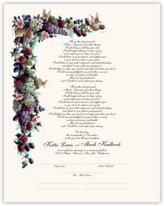 Our Fruit and Butterflies painting wedding certificate includes a unique hand-painted illustration of grapes and butterflies along the left and top edge, as well as your wedding vows or a verse of your choice. Customize the fonts, colors, or the number of signature lines for your guests.