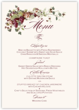 The Peach Roses and Berries wedding menu card will compliment weddings in the wine country or events with a wine or vineyard theme. Explore all of our fruit and grapes illustrations which feature grape graphics and fruit of all kinds. View Wine Trivia Examples