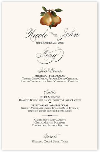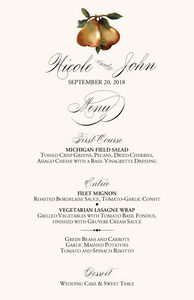 "The Perfect Pear" - These wedding reception dinner menus features two pears hanging from a branch at the top followed by a monogram of your choice. Customize with your choice of fonts, borders, or colors.