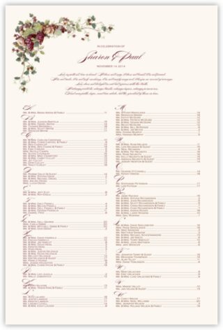 The Peach Roses and Berries wedding seating chart will compliment weddings in the wine country or events with a wine or vineyard theme. Explore all of our fruit and grapes illustrations which feature grape graphics and fruit of all kinds. View Wine Trivia Examples