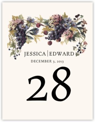 The Blue Grapes Cascade wedding table number cards will compliment weddings in the wine country or events with a wine or vineyard theme. Explore all of our fruit and grapes illustrations which feature grape graphics and fruit of all kinds. View Wine Trivia Examples