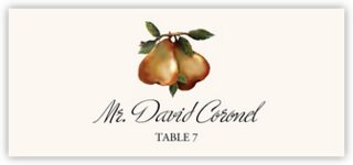 "The Perfect Pear" - these place cards and escort cards feature two Pears hanging from a branch at the top of each place card. Customize these place cards or escort cards with your choice of fonts or colors.