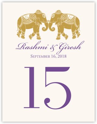 These Indian-inspired table numbers feature two decorative gold elephants at the top, customized with the bride and groom's initial on the saddle cloth. Can be customized in any colors and with or without the couple's name and wedding date.