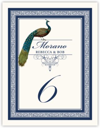 Add some color and flare to your wedding reception with these Peacock Flourish table numbers. Customize these cards with a different monogram, an alternative border, or differnet colors for the border or text.