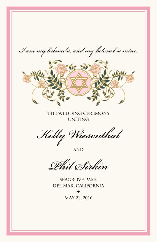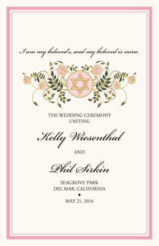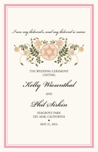 Our Colorful Shield of David Jewish wedding program explains the laws and customs of a traditional Jewish wedding. The program outlines rituals that that symbolize the beauty of the relationship of husband and wife, as well as their obligations to each other and to the Jewish people. Jewish wedding programs can include poems, prayers, songs and a listing of wedding party participants as well as an explanation of the Bashert, Ketubah, Bedeken, Chuppah, Circling, Birkat Erusin, Ring Ceremony, Sheva Brachot, Breaking of the Glass, Yikhud, Seduat Mitzvah and Purim. Wedding ceremony programs can also be customized with Hebrew text.