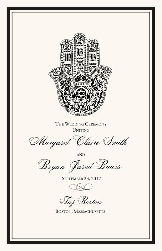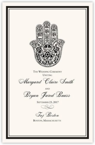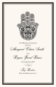 Our Hand of Miriam Jewish wedding programs will be a unique addition to your ceremony. The hand of Miriam is a Hamsa symbol that has been used hundreds, perhaps thousands of years to bring protection, luck, and good fortune. This Hamsa illustration has room for the bride and groom's monogram letters, and can be customized with any fonts, colors, as well as text.